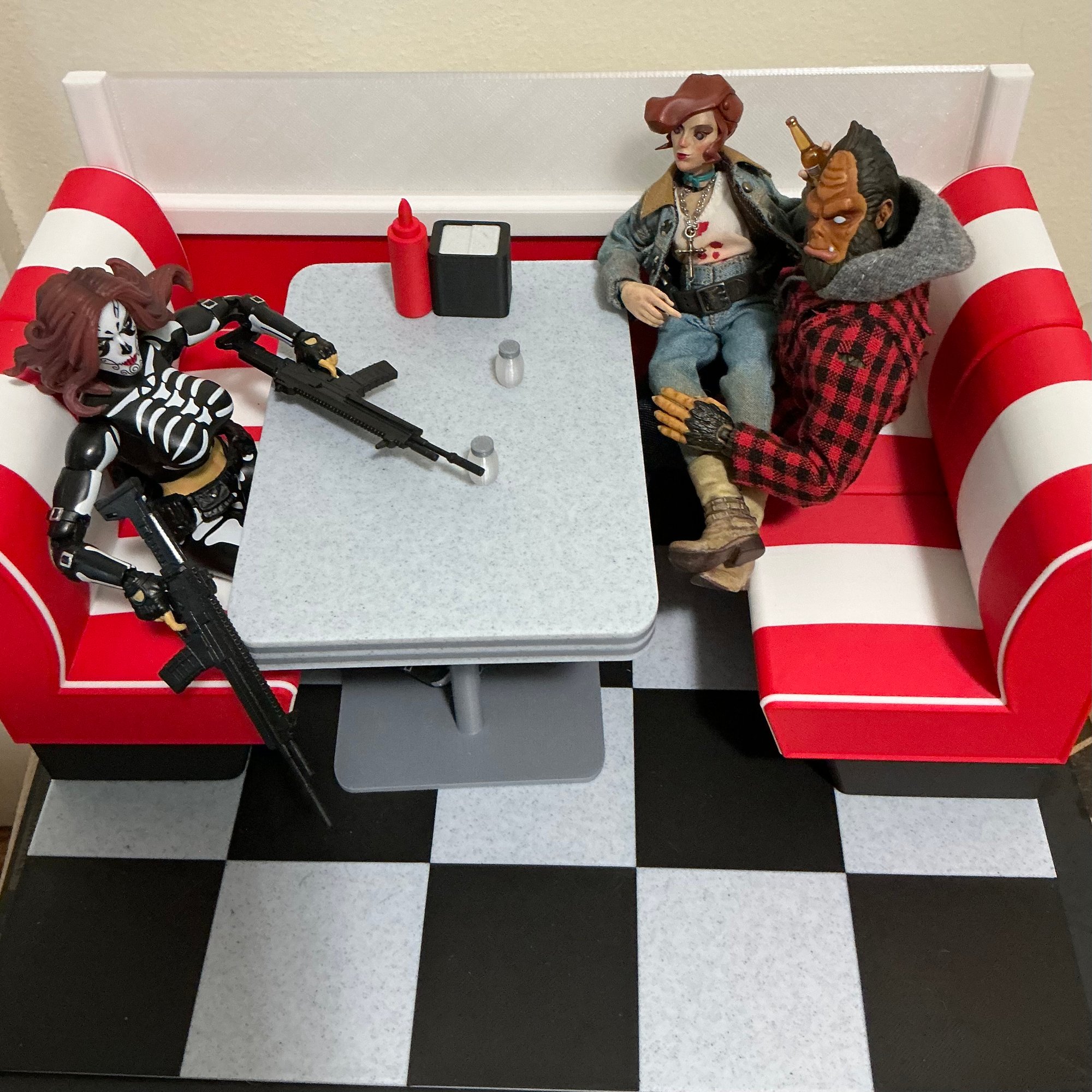 - Booth seating fits at least 4 figures in 1/12 or 1/10 scale